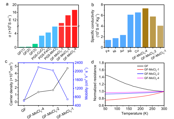 Figure 3. a)與純GF和先前文獻(xiàn)中報(bào)道的一些金屬氯化物插層的商用石墨片(PGS)相比,GF-MoCl5的高穩(wěn)定電導(dǎo)率;b)比較GF-MoCl5和幾種金屬導(dǎo)體的比電導(dǎo)率;c)霍爾效應(yīng)測量GF和GF-MoCl5的載流子密度和遷移率;d)GF和GF-MoCl5歸一化電阻的溫度依賴性