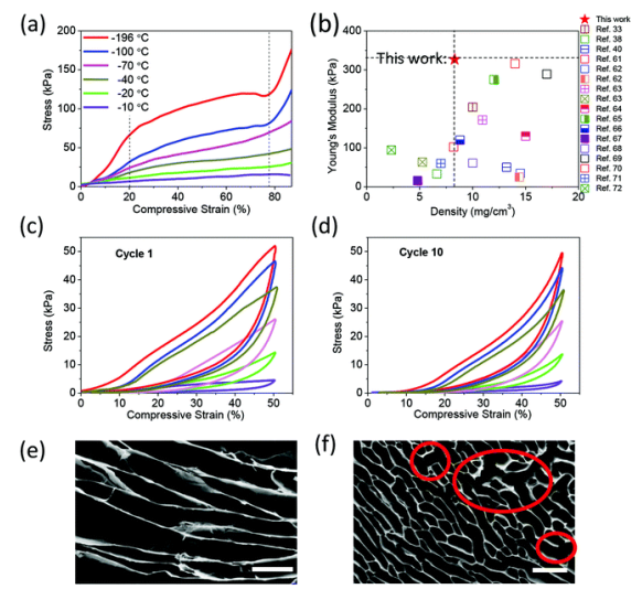 Fig. 6 (a) GA最大應(yīng)變85%以下的壓縮應(yīng)力-應(yīng)變曲線;(b)在−196°C凍結(jié)的GA的楊氏模量與當(dāng)前研究的比較;(c-d) GA最大應(yīng)變50%以下的壓應(yīng)力-應(yīng)變曲線(曲線1、10)。(e)和(f) GA壓縮后在-10°C和-20°C凍結(jié)的SEM圖。