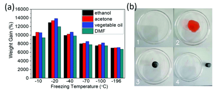 Fig. 7 (a) GA對(duì)各種化學(xué)溶劑和油的吸附能力;(b)去除用蘇丹紅III染色的乙醇照片。