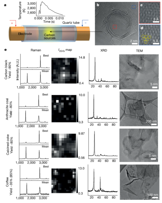 大多數(shù)塊狀石墨烯的生產(chǎn)采用自上而下的方法,即剝離石墨,但該方法通常需要大量的溶劑和高能混合、剪切、超聲波或電化學(xué)處理。雖然將石墨化學(xué)氧化為氧化石墨烯可促進剝離,但它需要強氧化劑,且在后續(xù)還原步驟中會使得石墨烯出現(xiàn)穿孔結(jié)構(gòu)缺陷。自下向上合成高質(zhì)量石墨烯的方法,如果采用化學(xué)氣相沉積或先進的合成有機方法,往往局限于超微量;如果采用整體溶液,則會產(chǎn)生缺陷。在這里,我們通過快速焦耳加熱廉價碳源(例如煤,石油焦炭,生物炭,炭黑,廢棄食品,橡膠輪胎和混合的塑料廢料),可以在不到一秒的時間內(nèi)獲得克量級的石墨烯。該產(chǎn)品以其生產(chǎn)工藝命名為快速石墨烯(FG),在堆疊的石墨烯層之間顯示出渦輪層排列結(jié)構(gòu)(即,幾乎沒有順序)。FG合成不需要加熱爐,不需要溶劑或反應(yīng)氣體,其產(chǎn)量取決于來碳源的含量。當(dāng)使用高碳源(例如炭黑,無煙煤或煅燒焦炭)時,產(chǎn)量為80%至90%,而碳純度可達99%以上,且生產(chǎn)過程不需要任何凈化步驟。拉曼光譜分析顯示FG存在一個低強度或缺失的D帶,這表明FG是迄今報道的石墨烯中最低缺陷濃度之一,并證實了FG的渦輪應(yīng)變堆積,這與渦輪應(yīng)變石墨有著明顯的區(qū)別。FG層的無序取向有利于其在復(fù)合材料形成過程中混合后迅速剝落。FG合成的電能成本僅為每克7.2千焦耳,這可使FG適用于塑料,金屬,膠合板,混凝土和其他建筑材料的大塊復(fù)合材料中。