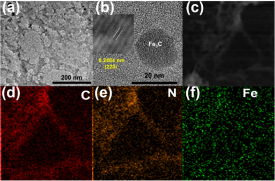 x@NPCN的STEM圖像以及(d) C,(e) N和(f) Fe的相應(yīng)元素映射。