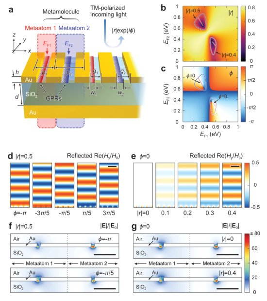 Figure 1. (a)由一對(duì)獨(dú)立控制的石墨烯等離子體元原子組成大分子的示意圖。反射的(b)振幅圖和(c)相圖。反射的橫向磁場(chǎng)分量(H