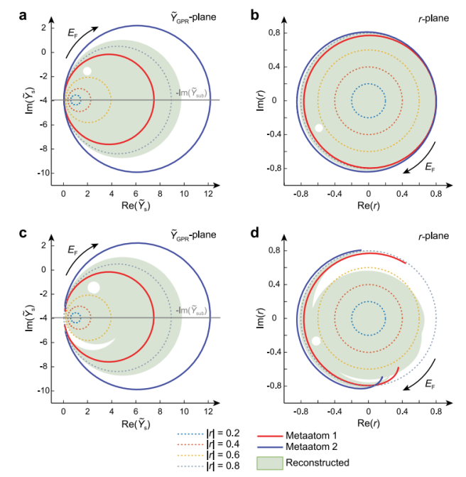 Figure 2. 在理想情況下,顯示為閉合圓的(a)表面導(dǎo)納和(b)復(fù)振幅。在實(shí)際情況下,呈現(xiàn)電弧的(c)表面導(dǎo)納和(d)復(fù)振幅。