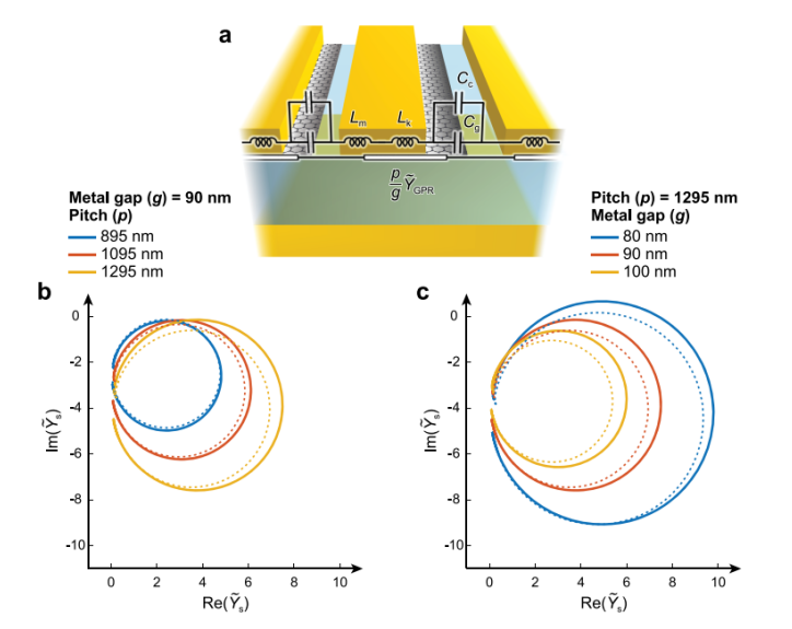 Figure 3. (a)元原子電路模型的示意圖。(b)當(dāng)螺距隨固定金屬間隙變化時(shí),用電路模型計(jì)算表面導(dǎo)納。(c)當(dāng)金屬間隙隨固定螺距變化時(shí),用電路模型計(jì)算表面導(dǎo)納。