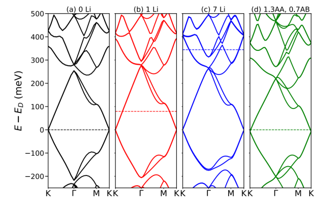 我們使用第一性原理電子結(jié)構(gòu)計算,研究了鋰嵌入雙層扭曲石墨烯中的影響。為了對該系統(tǒng)進行建模,采用了相應(yīng)的超晶胞,它們對應(yīng)于7.34°和2.45°的扭曲角。從鋰吸收的能量學上,我們證明了對于低的Li濃度,嵌入劑聚集在AA區(qū)域中,密度是均勻分布的兩倍。Li原子提供給石墨烯層的電荷會改變能帶結(jié)構(gòu),這種能帶結(jié)構(gòu)可以使用參數(shù)空間區(qū)域中經(jīng)過修改的層間耦合的連續(xù)模型定性地捕獲,但該參數(shù)空間尚未通過實驗或理論進行探索。因此,插入層和扭曲層的組合同時提供了對材料特性進行空間控制的手段,以及一個額外的旋鈕,可用來調(diào)節(jié)石墨烯扭曲雙層中的莫爾層物理特性,其潛在應(yīng)用范圍從能量存儲和轉(zhuǎn)換到量子信息。