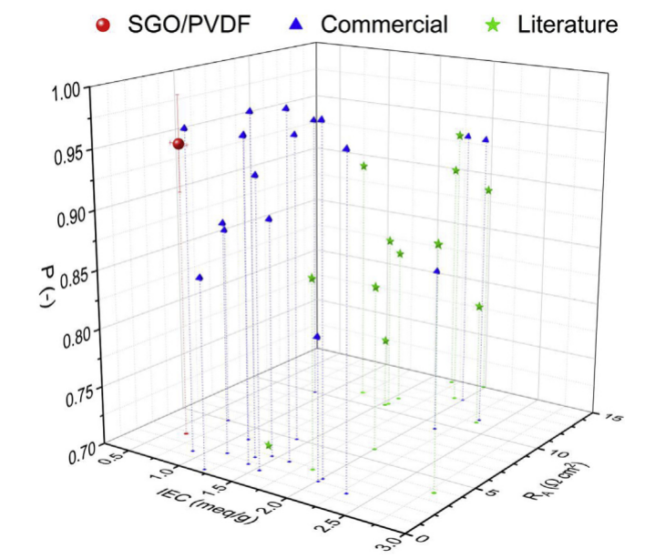 Figure 5. SGO/PVDF與商用CEM和其他異質(zhì)CEM的離子交換容量(IEC)、滲透選擇性(P)和區(qū)域電阻(R