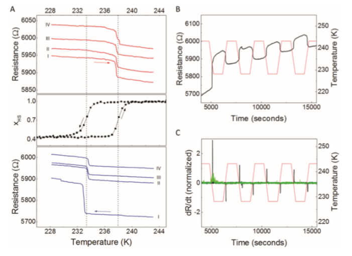Figure 2. 利用化學(xué)-電選通技術(shù)檢測自旋相變。A) SCO材料中高自旋分子的電阻(藍色、紅色)和xHS分數(shù)隨溫度的變化。B)石墨烯晶體管電阻和溫度隨時間變化的情況。C) dR/dt, R在第一次躍遷前歸一化,以及溫度隨時間的變化.