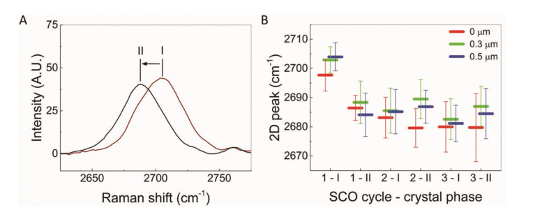 Figure 4. 不同間隔層厚度的無電極器件在多重自旋交叉作用下的拉曼光譜研究。A)在第一個SCO周期中,相I的2D峰值為243 K,相II的峰值為223 K。B)多次躍遷后的2D峰值。