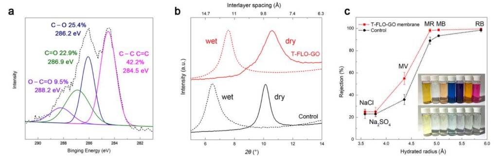 Figure 4. a)T-FLO-GO膜(帶有32 nm厚的選擇性層)上表面的XPS C1s譜。b)X射線衍射顯示(001)峰發(fā)生偏移,因?yàn)镚O膜中的選擇性層在浸入水中后發(fā)生膨脹。c)分子篩分能力與溶質(zhì)水合半徑的關(guān)系。