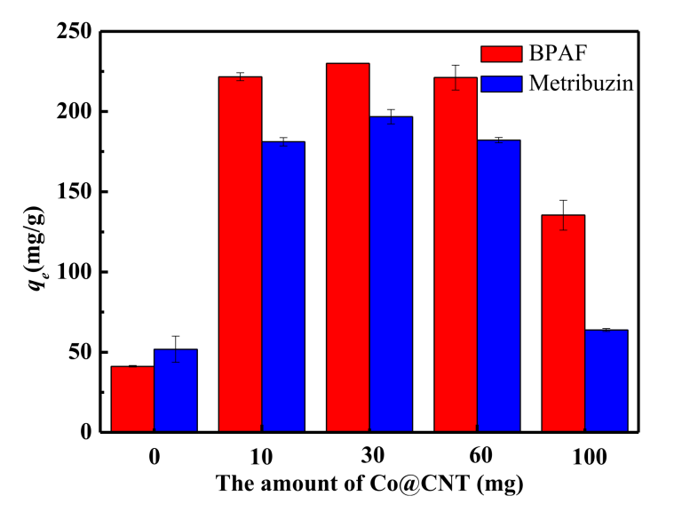 Figure 3. BPAF和嗪草酮吸附量與Co@CNT負(fù)載量的關(guān)系。
