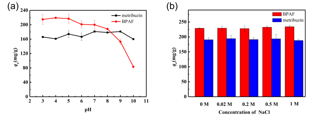 Figure 4. 兩種有機(jī)物在N-MIL@CNT上的吸附量與(a)pH值(T=298 K; t=5 h)和(b)離子強(qiáng)度的關(guān)系。