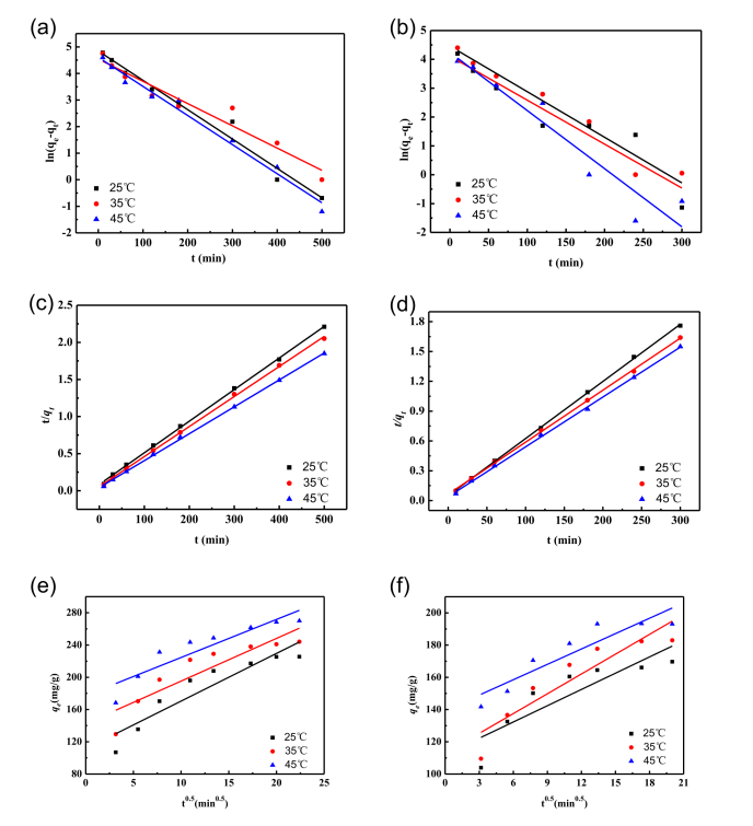 Figure 6. 使用準(zhǔn)一級(jí)動(dòng)力學(xué)公式模擬的(a)BPAF和(b)嗪草酮的吸附曲線。使用準(zhǔn)二級(jí)動(dòng)力學(xué)公式模擬的(c)BPAF和(d)嗪草酮的吸附曲線。使用粒子內(nèi)模型模擬的(e)BPAF和(f)嗪草酮的吸附曲線。