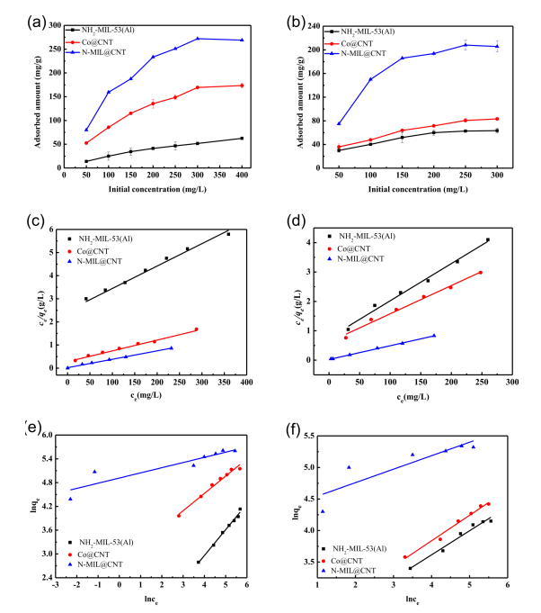 Figure 7.(a)BPAF和(b)嗪草酮的吸附等溫線(T = 298 K; t =5小時(shí))。使用Langmuir模型擬合的(c)BPAF和(d)嗪草酮的吸附曲線。使用Freundlich模型擬合的(e)BPAF和(f)嗪草酮的吸附曲線。