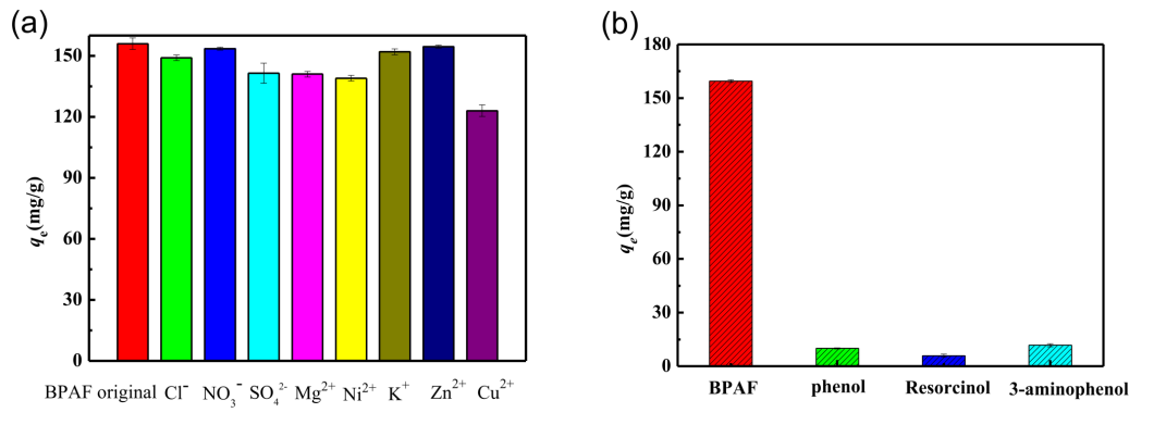 Figure 8.(a)各種共存離子對(duì)N-MIL@CNT吸附BPAF的影響。(b)N-MIL@CNT對(duì)四種酚類物質(zhì)吸附能力的比較。