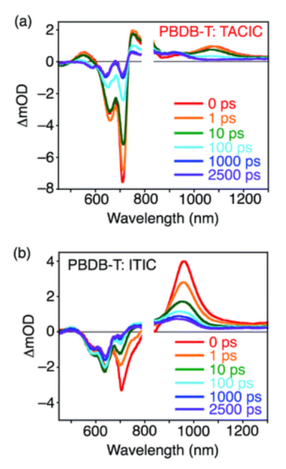 Fig. 5 (a) PBDB-T:TACIC和(b) PBDB-T:ITIC共混膜在0-2500 ps范圍內的瞬態(tài)吸收光譜。
