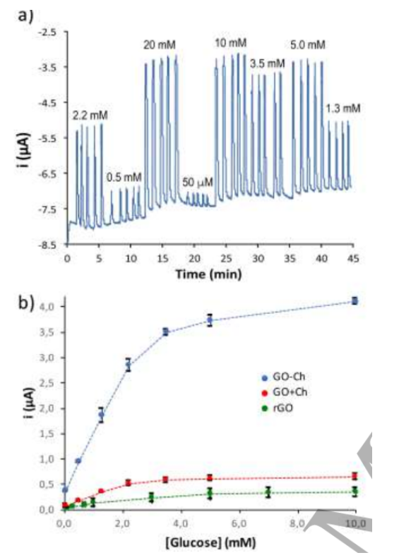 氧化石墨烯(GO)涂層電極為酶催化葡萄糖檢測提供了極好的平臺,這是由于葡萄糖氧化酶的存在以及電化學(xué)轉(zhuǎn)換誘導(dǎo)而發(fā)生的。這里表明了GO層對于葡萄糖檢測的靈敏性,若將GO與殼聚糖(GO+Ch)混合,靈敏度會增加到兩倍,而如果GO與殼聚糖以共價結(jié)合存在(GO-Ch),其性能會增加至八倍。另外,GO-Ch復(fù)合材料的導(dǎo)電性適用于電化學(xué)反應(yīng),而無需還原GO。GO的共價修飾是利用殼聚糖豐富的氨基側(cè)鏈,通過標(biāo)準(zhǔn)的羧基活化/酰胺化方法來實現(xiàn)的。采用非活化GO作為前驅(qū)體合成對照樣品,以此來證實樣品功能化的成功。先通過滴涂法將復(fù)合GO-Ch沉積在標(biāo)準(zhǔn)的絲網(wǎng)印刷電極上,再進行電化學(xué)測試。測試結(jié)果表明:GO-Ch共價物的檢測效率和可靠性均高于Ch-GO混合物和初始GO,這將其歸因于豐富的酶結(jié)合位點以及羧基活化過程中引起GO局部還原。