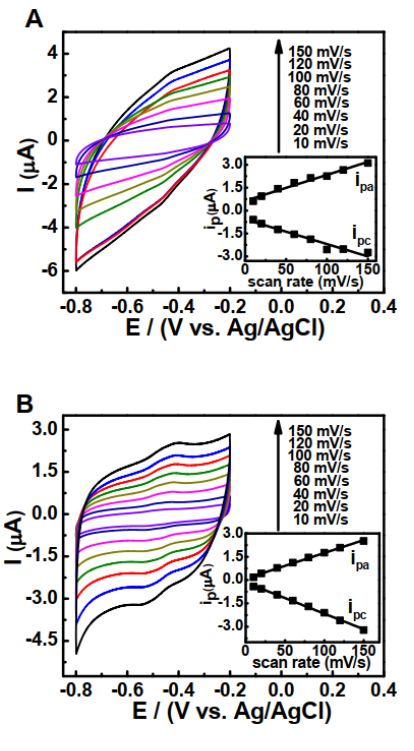 Figure 3. (a)GOx/rGO/Nafion/GCE, (b) GOX/AuNDs-rGO/Nafion/GCE 電極在不同掃速下的CV曲線,測試溶液:N2飽和的0.1 M PBS (pH 7.4)。