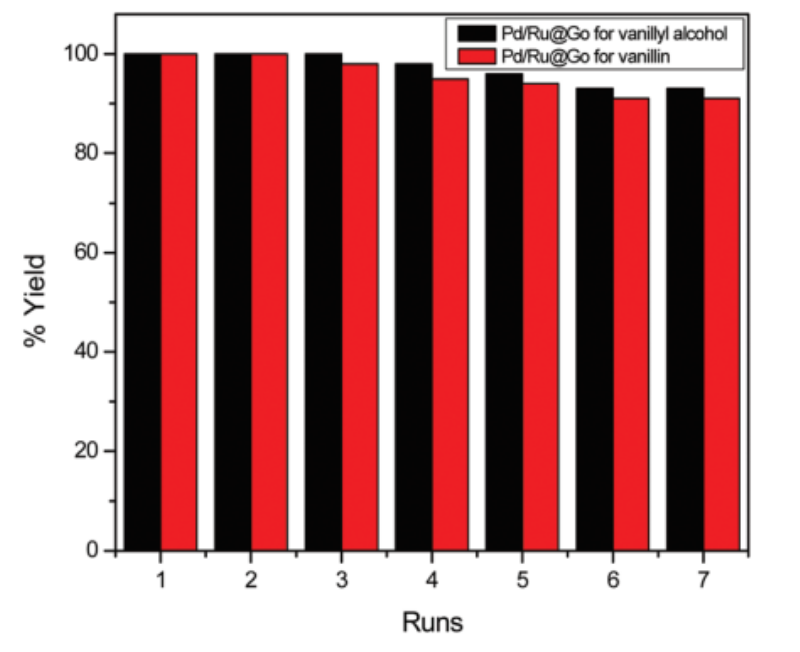 Figure 5. Pd/Ru@GO用于香草醇和香蘭素的加氫脫氧反應(yīng)的循環(huán)測(cè)試研究。