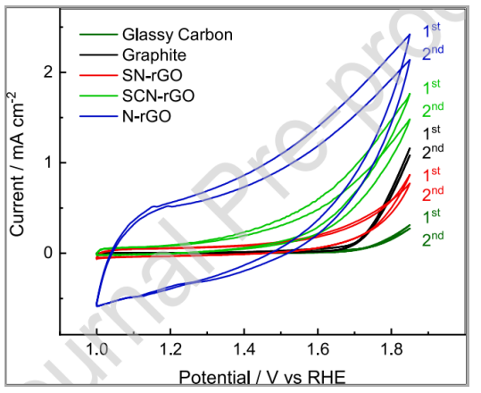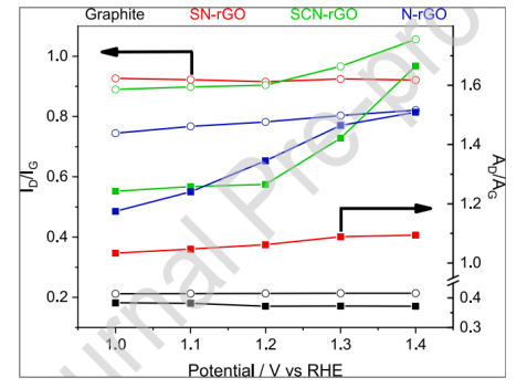 原位拉曼光譜、旋轉(zhuǎn)圓盤電極(RRDE)、循環(huán)伏安法(CV)和線性掃描伏安法(LSV)技術(shù)用于測定石墨和雜原子摻雜的石墨烯催化劑對氧析出反應(yīng)(OER)的催化活性。主要結(jié)果表明,OER除了與電解質(zhì)介質(zhì)的相互作用外,還受到摻雜劑的性質(zhì)和數(shù)量的強烈影響,這也決定了A