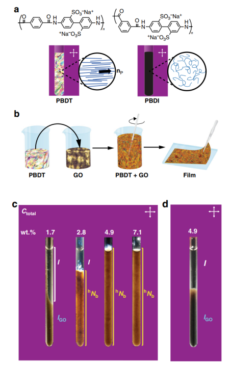 Figure 1. (a)PBDT和PBDI的分子結(jié)構(gòu)。(b)水基合成法制備PBDT+GO納米復(fù)合膜。(c)PBDT+GO水溶液的相穩(wěn)定性。(d)PBDI+GO水溶液。