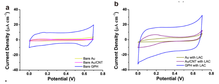 Fig. 2(a)裸金、用CNT修飾的Au以及裸GPH電極的循環(huán)伏安曲線。(b)吸收LAC后的循環(huán)伏安曲線。掃描速率為50 mV/s,使用空氣飽和的PBS緩沖液(pH 4.5)。