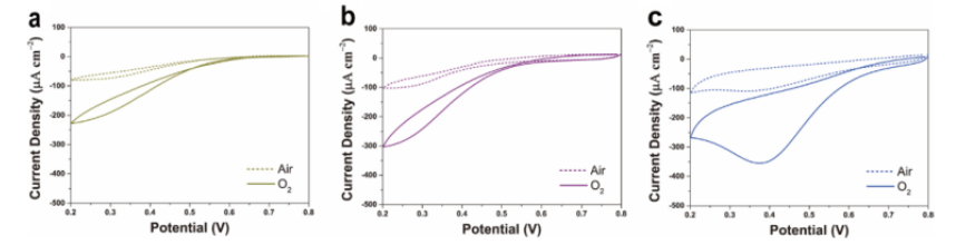 Fig. 4 在0.1 M PBS中記錄的CV,pH = 4.5,掃描速率50 mV/s:(a)裸露和LAC固定的Au,(b)裸露和LAC固定的Au/CNT,(c)裸露和LAC固定的GPH。虛線表示空氣飽和緩沖液測試,實線表示O