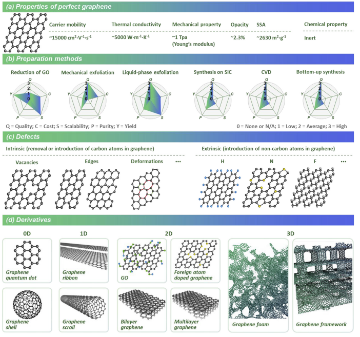 Figure 2. 石墨烯的性質(zhì)、制備方法、缺陷和衍生物。(a)在電導(dǎo)率、熱導(dǎo)率、機(jī)械行為、不透明度、SSA和化學(xué)行為方面的各種特性。(b)就石墨烯質(zhì)量、成本、可擴(kuò)展性、純度和產(chǎn)率而言,最常見(jiàn)的石墨烯合成途徑。(c)在石墨烯中引入內(nèi)在或外在缺陷。(d)石墨烯衍生物不同結(jié)構(gòu)的示意圖。