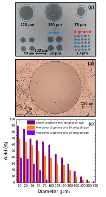 Figure 2. 用IFM除去PMMA后的膜。(a)不同直徑的雙層石墨烯膜的SEM圖,(b)直徑為750μm的雙層石墨烯膜光學(xué)圖,(c)小晶粒尺寸(<20μm)的單層石墨烯膜的產(chǎn)量。