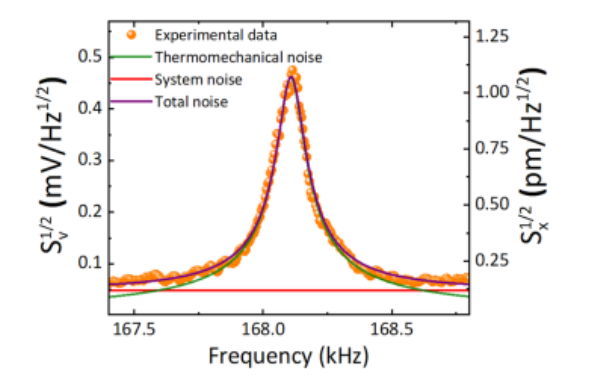 Figure 4. 石墨烯膜的熱機(jī)械噪聲測(cè)量。通過(guò)執(zhí)行非線性擬合具有背景的洛倫茲方程,獲取了共振頻率和質(zhì)量因子。