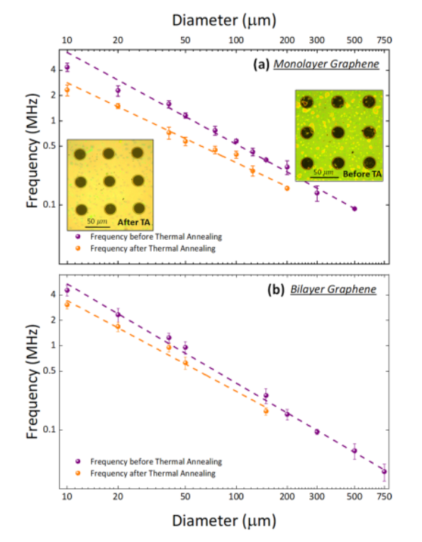 Figure 5. 測(cè)量的共振頻率。(a)單層石墨烯膜,插圖為熱處理前后的對(duì)比圖,(b)雙層石墨烯,紫色代表熱處理前,橙色代表熱處理后,共振頻率與直徑顯示出很好的線性關(guān)系。