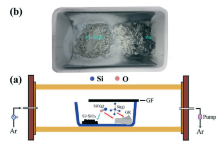 Figure 1.(a)通過熱蒸氣法合成具有納米片的SiC納米線示意圖,該過程不添加額外的金屬催化劑,(b)產(chǎn)物的數(shù)字光學照片。
