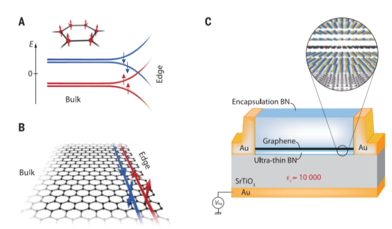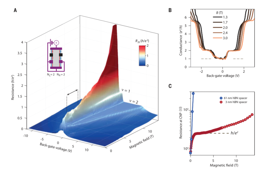 3)襯底的高介電常數(shù)的庫侖相互作用,我們將石墨烯零級朗道能級的基態(tài)調(diào)整到拓?fù)湎?。在低?特斯拉的磁場下出現(xiàn)了堅固的螺旋邊緣傳輸,并在微米長的距離上承受高達(dá)110開爾文的溫度。這個多功能的石墨烯平臺可以在自旋電子學(xué)和拓?fù)淞孔佑嬎阒邪l(fā)揮作用。