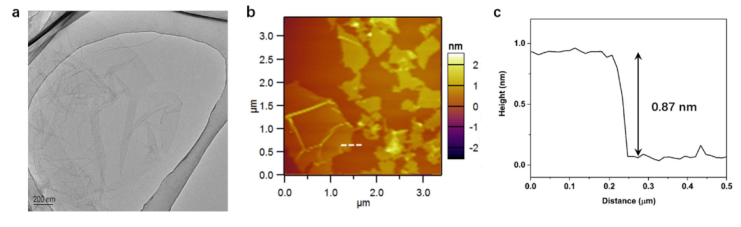 Figure 1. (a)單層氧化石墨烯納米片的TEM圖;(b)AFM形貌圖顯示了這項(xiàng)工作中使用的氧化石墨烯納米片的厚度;(c)氧化石墨烯納米片的高度分布(根據(jù)(b)中的虛線)。