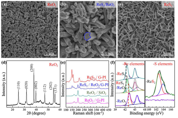 2晶體的X射線衍射圖譜;(e)幾種納米結(jié)構(gòu)材料的拉曼光譜;(f)生長(zhǎng)的ReO