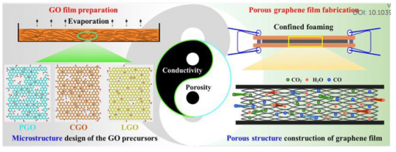Figure1. 各種GO前驅(qū)體的結(jié)構(gòu)特征說(shuō)明,以及密閉發(fā)泡方法可控制備多孔石墨烯薄膜示意圖。
