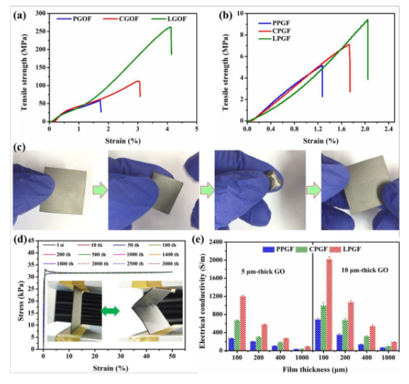 Figure 4. (a)10μm厚的GO膜和(b)200μm厚多孔石墨烯薄膜的應(yīng)力與應(yīng)變曲線,(c)200μm厚LPGF的折疊和皺縮視頻快照,(d)200μm厚LPGF的循環(huán)壓縮性能,(e)膨脹多孔石墨烯的電導(dǎo)率變化情況。