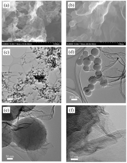 Figure 1. 800℃下保溫1 h獲得的GCS復合材料(GCS@800)的(a)低倍和(b)高放大倍率的SEM圖。GCS@800復合材料的TEM圖:(c)低倍和(d-f)高倍率TEM圖。