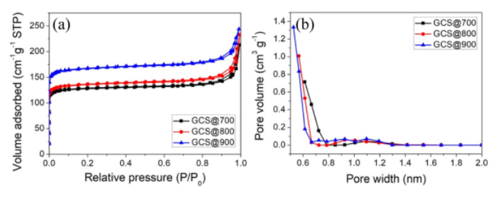 Figure 3. (a)GCS@700,GCS@800和GCS@900復合材料的氮吸附-解吸等溫線,以及(b)相應的孔徑分布曲線。