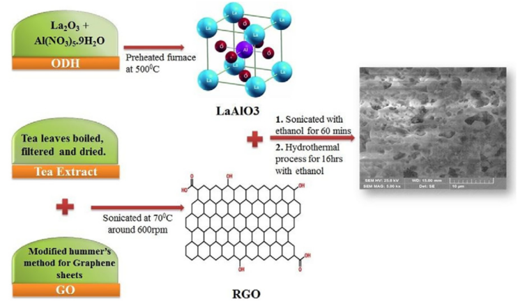 3)和還原氧化石墨烯復(fù)合物(RGO)。此處,綠茶提取物用作還原劑,用于將氧化石墨烯轉(zhuǎn)化為還原氧化石墨烯。使用XRD、SEM、EDAX、FTIR和BET技術(shù)對(duì)合成材料的形貌進(jìn)行了表征。該材料用作超級(jí)電容器應(yīng)用的電極材料。電子顯微圖像表明,RGO薄片緊密地附著在LaAlO