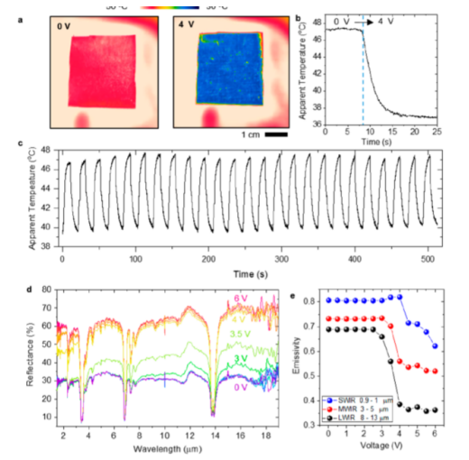 Figure 2. 紡織品紅外輻射的動態(tài)控制。(a)用長波長(8-13 um)紅外攝像機(jī)在高發(fā)射率(0 V)和低發(fā)射率(4 V)狀態(tài)下記錄的棉基紡織品裝置的熱圖像。(b)施加4v后裝置表觀溫度的時(shí)間變化。(c)在周期為20 s的正方形電壓波形(-2和4v)下表觀溫度的長期時(shí)間變化。(d)當(dāng)外加電壓在0~6v之間變化時(shí)記錄器件的紅外反射光譜。(e)該裝置在短、中、長波紅外范圍內(nèi)的平均發(fā)射率與所施加電壓的函數(shù)關(guān)系。