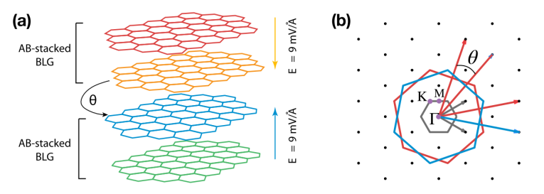 Figure 1. (a)構(gòu)型示意圖。(b)θ=21.8°(m=1)TDBG的倒數(shù)晶格(黑點(diǎn))和微型布里淵區(qū)(灰色六邊形)。