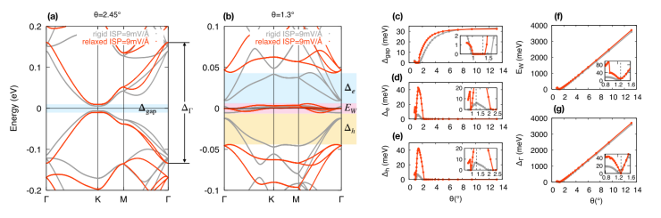 Figure 3. 使用TB+ISP模型計(jì)算的(a)θ=2.54°和(b)θ=1.30°的剛性和松弛TDBG的能帶結(jié)構(gòu)。(c-e)帶隙Δ