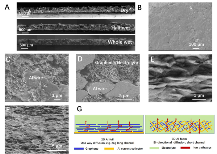 Figure 1. 石墨烯、泡沫鋁和石墨烯-鋁泡沫電極的表征。