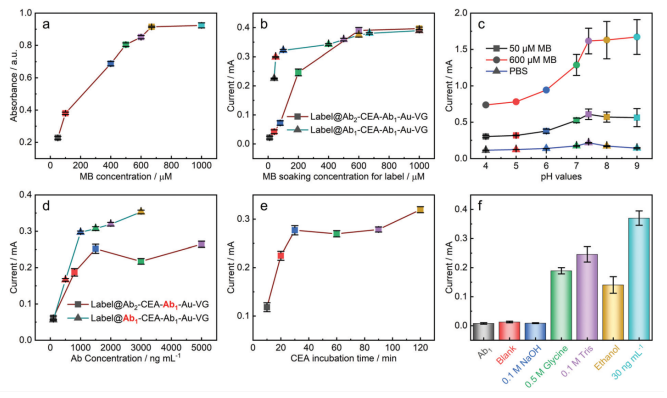 -1標簽的MB浸泡濃度。(c)pH值與MB峰值電流的關系。(d)Ab1濃度。(e)CEA孵化時間。(f)再生方法。