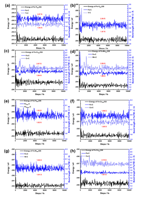 Figure 2. AIMD模擬中的八種Fe-TM/GS催化劑的能量和鍵長。