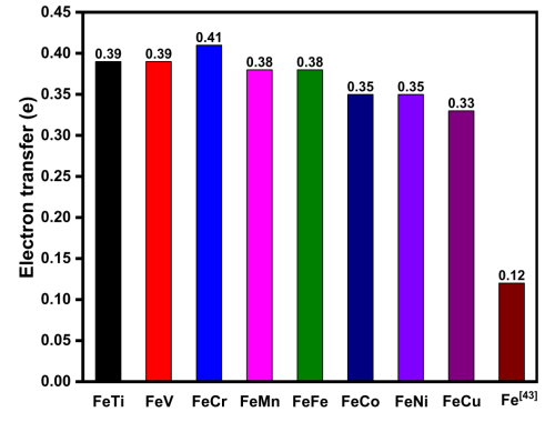 DA/GS中具有最高的NRR催化活性,吉布斯能量變化為0.88 eV。通過對電子密度差、能帶結(jié)構(gòu)和功函數(shù)的分析,電子轉(zhuǎn)移是影響氮吸附的主要因素,第二金屬原子通過促進氮與石墨烯表面之間的電子轉(zhuǎn)移提高了NRR的催化活性。這項理論研究為開發(fā)用于NRR的高效電催化劑提供了新見識。