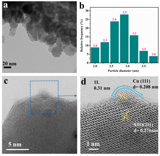 Figure 2. (a)Cu@C/STO結(jié)構(gòu)的HRTEM圖像。(b)從50多個顆粒中計算出的粒徑分布直方圖。平均粒徑為2.8nm。(c)Cu@C/STO的ACTEM圖像。(d)樣品Cu@C/STO(放大的選擇區(qū)域)中的Cu納米顆粒的ACTEM圖像。