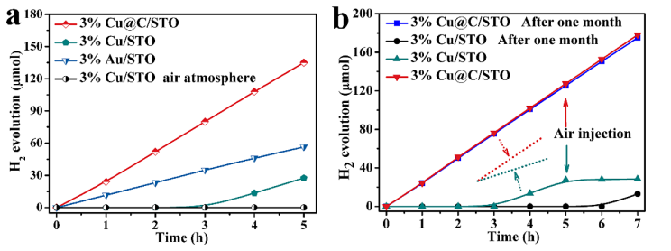 2釋放速率。(b)3%Cu/STO、3%Cu@C/STO的光催化H
