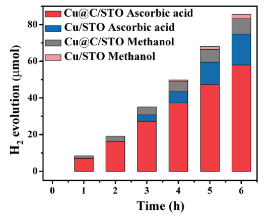 Figure 5. 3%Cu/STO和3%Cu@C/STO在不使用助劑的水溶液中,在可見光照射下(λ>400 nm)的光催化H