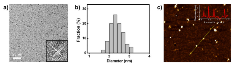 Figure 1. (a) t-GQDs的TEM圖像和具有晶格間距的t-GQDs的HRTEM圖像(插圖)。(c) t-GQDs表面形貌測(cè)量AFM圖像。